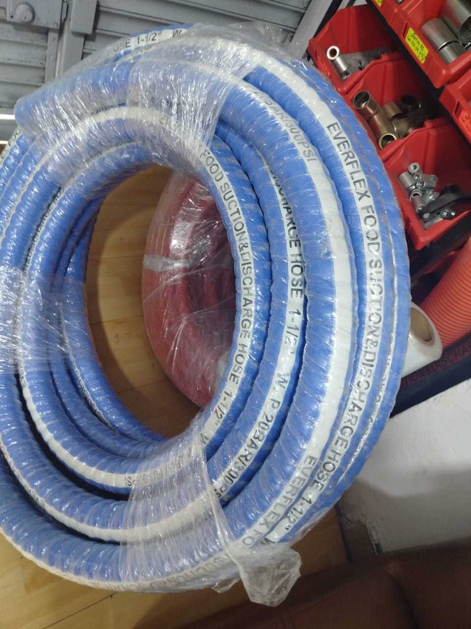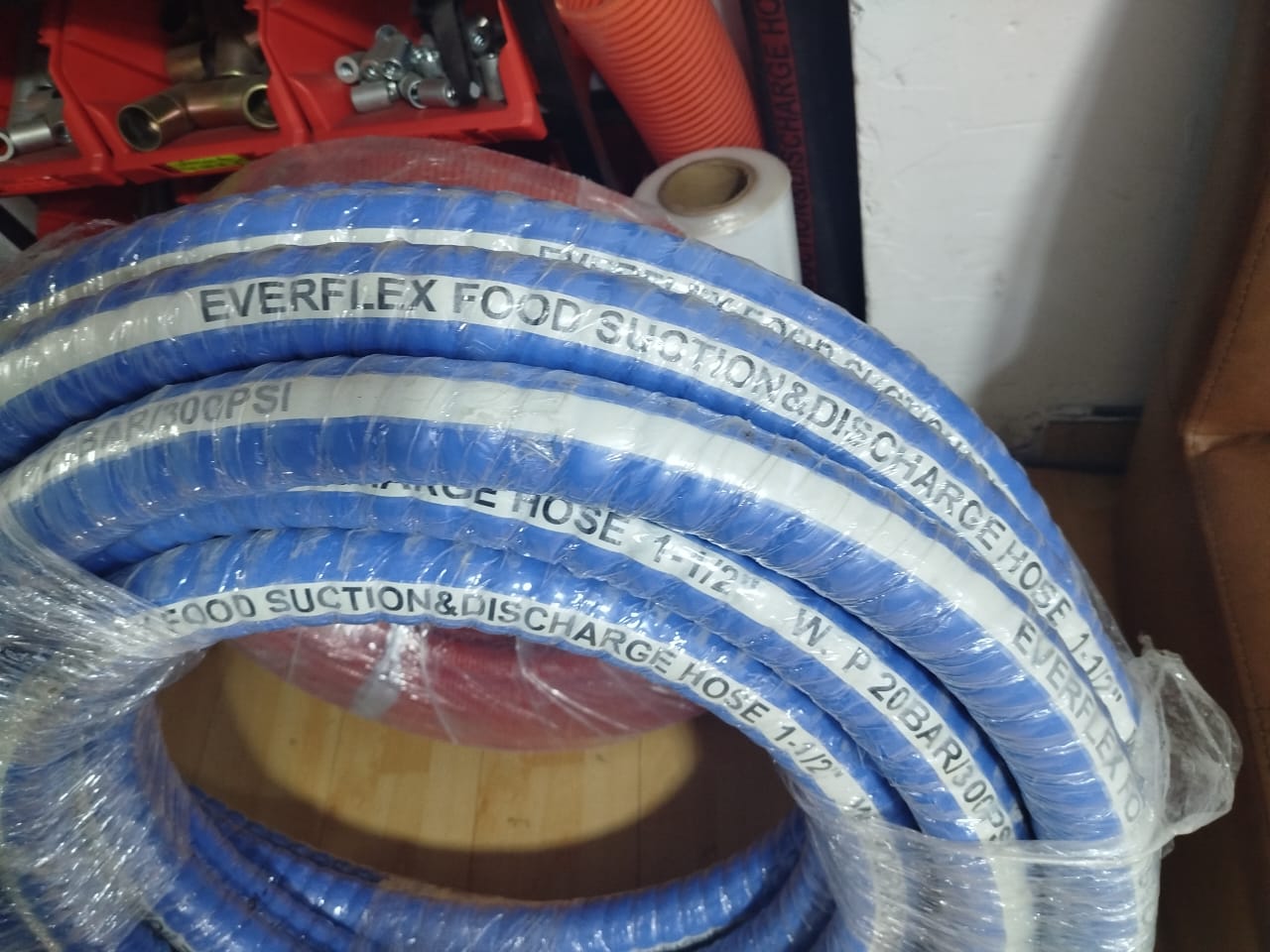 Tubo: Caucho blanco, liso, NR, NBR o EPDM de calidad alimentaria Refuerzo: Tejido sintético multicapa de alta resistencia y alambre helicoidal Cubierta: Liso (acabado envuelto), caucho sintético, azul o blanco, resistente a la intemperie.